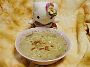 ラーメンは4分たつとできあがるです。 キティのどんぶりにうつしかえます。 |