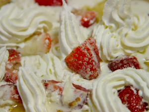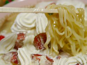 クリームとイチゴが麺の上で楽しそうですね♪ |