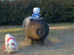 木彫りのブタさんがいました。さっそく背中に登っていい気分です。
