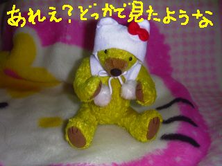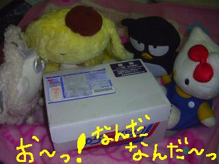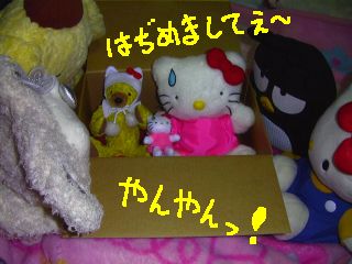 荷物が届く前日に「おまぬけキティさんと、くまさんのくまさんを送ったですう!!」ってメールをいただいたんですが、はて、「おまぬけキティさん」はなんとなくわかるけど、「くまさんのくまさん」っていうのは何だろうって思って荷物が届くのを待っておりました。夜8時過ぎにやっと届きまして、開けてびっくり玉手箱、ナゾはすべて解けたですうってやつです。やんやん!