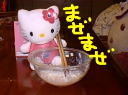 よーくまぜまぜしたら、キティの顔型に入れます。 ...入れたら1/4くらいしかありません。 |