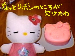 顔型から取り出します。いちおうケーキが型にくっつかないようにはなっているのですが、ちょっと失敗して、耳リボンの一部が欠けてしまいました。 キティにはちょいとばかり難しかったようですね。 |