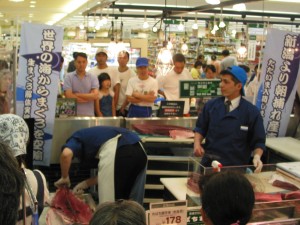 解体したマグロをその場で短冊にして販売です。